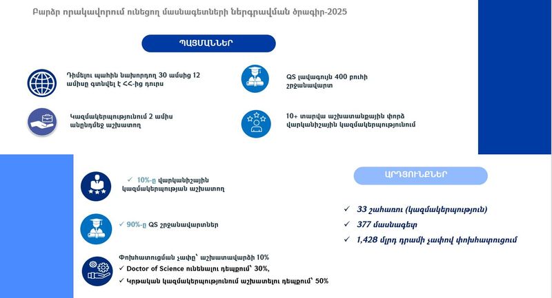 • ավարտել է ծրագրին դիմելու տարում հրապարակված QS համաշխարհային համալսարանների վարկանիշի (QS World University Rankings) առաջատար 400 (չորս հարյուր) ԲՈՒՀ-երից որևէ մեկը,