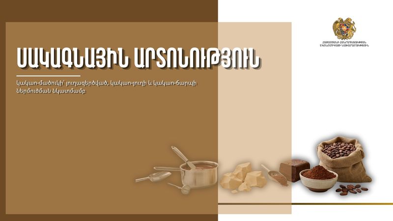 ՀՀ կառավարության կողմից հաստատվել է «Հայաստանի Հանրապետության տարածք առանց ներմուծման մաքսատուրքի վճարման կակաո-մածուկի՝ յուղազերծված, կակաո-յուղի և կակաո-ճարպի ներմուծման մասին» Հայաստանի Հանրապետության կառավարության որոշումը /02.04.2026, N 427- Ն/։